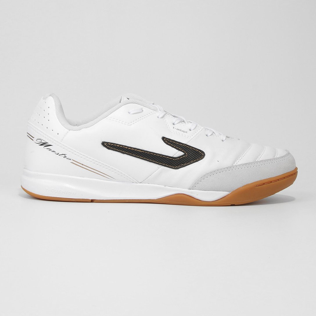 Brilhe dentro das quatro linhas jogando com a Chuteira de Futsal Topper. O modelo Maestro Pro III tem design clássico com cabedal confeccionado em material sintético com costuras para maior durabilidade, além de calcanhar acolchoado e fecho em cadarço para ajuste firme e eficiente. O tênis futsal possui também uma camada de EVA presente na entressola para amortecimento leve e um solado emborrachado antiderrapante que te oferece mais segurança para arriscar dribles, passes e chutes nas quadras indoor e outdoor. Complete seu uniforme de jogo com a Topper usando a Chuteira Futsal da marca e marque esse golaço.